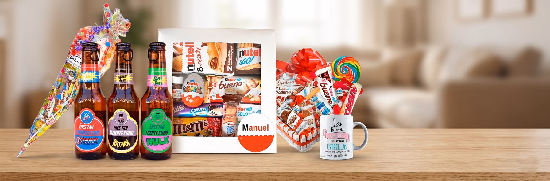 Nuestra pasión se refleja en nuestras icónicas tartas de chocolate Kinder y Milka, el regalo estrella para cumpleaños y aniversarios. Cada cesta y tarta se monta de forma artesanal, asegurando que marcas como Kinder Joy, Nutella o Ferrero lleguen con una presentación impecable. Además, nuestra línea de personalización exclusiva (lámparas grabadas, marcos con fotos y cervezas con etiquetas propias) permite que cada cliente cree un detalle verdaderamente único que no encontrará en tiendas convencionales.