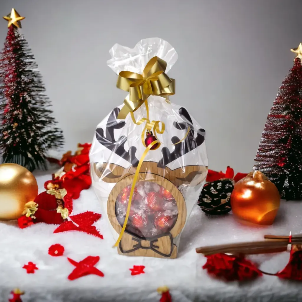 Esta Navidad, tu regalo de empresa o familiar puede ser una joya. Si buscas algo que fusione la decoración con la exquisitez, nuestra Bombonera de Madera con Bombones Lindor es la elección definitiva. Este reno de madera, con un diseño cautivador y acabados en metacrilato transparente, permite admirar el tesoro que lleva dentro: 156 gramos de auténticos Bombones Lindor. Es un regalo que conjuga la elegancia rústica con la calidad premium del chocolate suizo, asegurando un impacto visual inmediato.