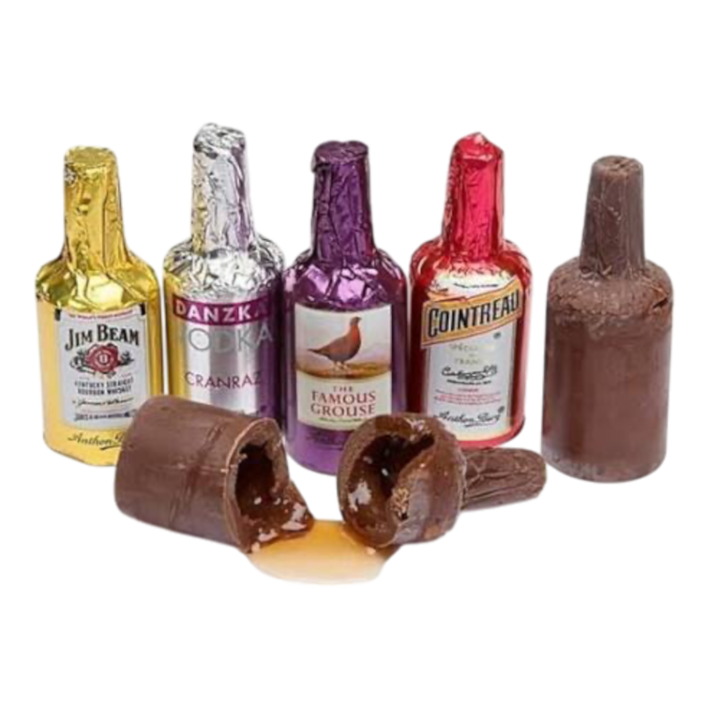 La presentación es impecable y de gran distinción. Cada bombón se envuelve individualmente en papel de aluminio. El envoltorio imita la botella de la marca de licor que contiene. La diversidad es la clave de su gran atractivo.
