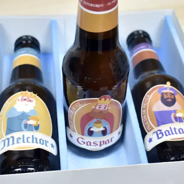 - Diseño exclusivo: Etiquetas ilustradas con los Reyes Magos: Melchor, Gaspar y Baltasar.