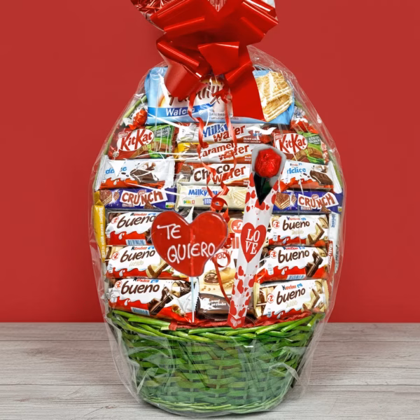 Ideal para regalar el 14 de febrero, aniversarios o cualquier ocasión especial, esta cesta está llena de los chocolates Kinder más populares, presentada en un diseño romántico listo para regalar.Además contiene una rosa de chocolate y una piruleta de caramelo «Te Quiero».