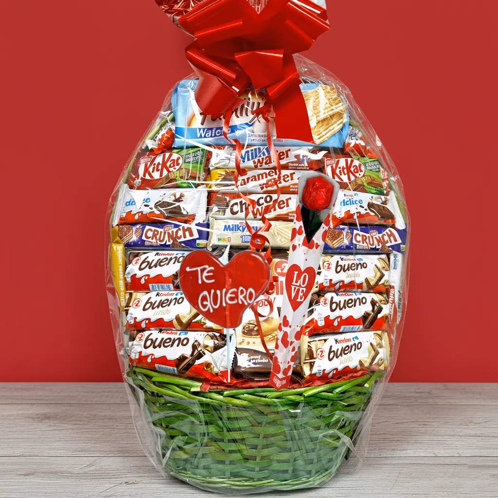 Si buscas una cesta de chocolates Kinder para San Valentín,una flor de chocolate o una piruleta de caramelo con la palabra te quiero. Esta es la opción perfecta para decir “Te quiero” de la forma más dulce.