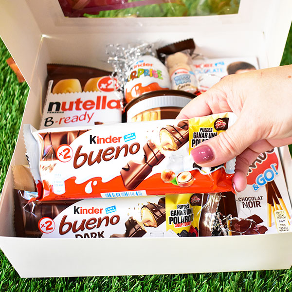 Ingredientes: Chocolate blanco 28% (manteca de cacao, azúcar, LECHE desnatada en polvo, MANTEQUILLA concentrada, emulgentes: lecitinas (SOJA); aromas), azúcar, manteca de palma, harina de TRIGO, LECHE desnatada en polvo, LECHE entera en polvo, AVELLANAS (5%), suero LÁCTEO en polvo, almidón de TRIGO, cacao desgrasado (0,4%), aceite de girasol, proteínas de la LECHE, emulgentes: lecitinas (SOJA), gasificantes (carbonato ácido de amonio, carbonato ácido de sodio), aromas, sal.