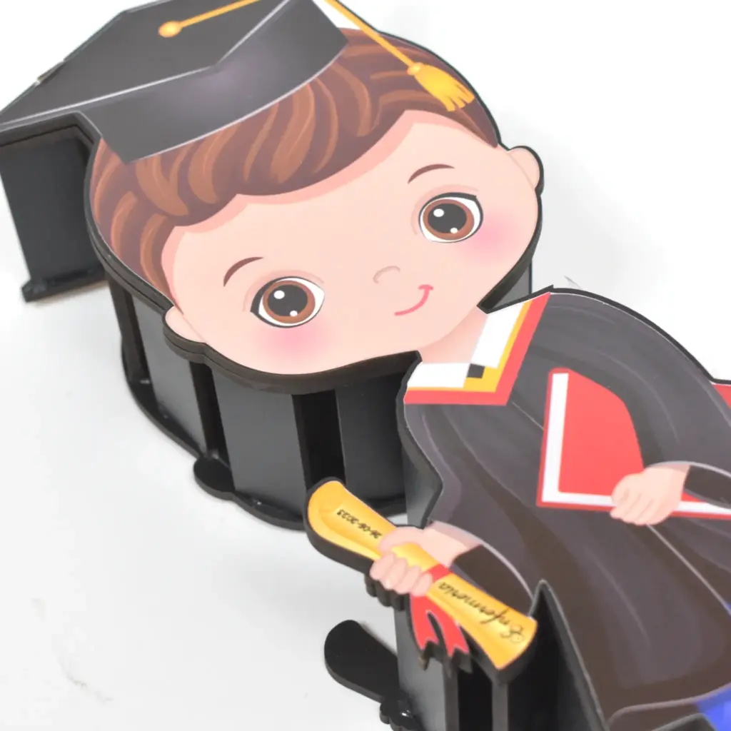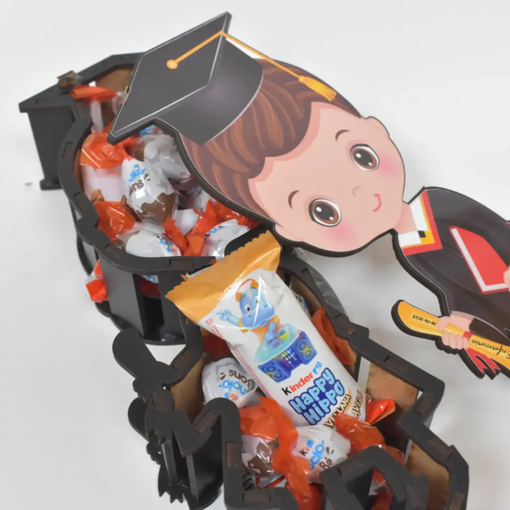 Estuche madera Graduación niño personalizado.Regalo perfecto para un graduado. ¡No busques más! Presentamos un regalo único y personalizado que seguro será el centro de atención en cualquier ceremonia de graduación. Imagina un adorable muñeco de madera vestido con la toga y el birrete característicos de la graduación, pero con un giro emocionante: ¡se abre para revelar una caja llena de deliciosos chocolates Kinder!