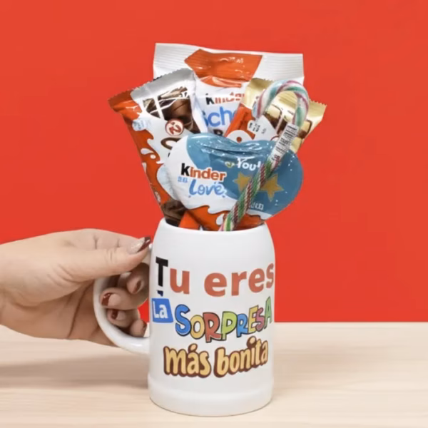 Si busca un detalle original y verdaderamente delicioso, usted elige bien con nuestra Jarra Cerámica Chocolates Kinder. De hecho, esta jarra de gran capacidad es la opción ideal para sorprender a esa persona especial. Por cierto, la jarra lleva la tierna frase “Tú eres la sorpresa más bonita”, la cual transmite cariño y emoción desde el primer instante.