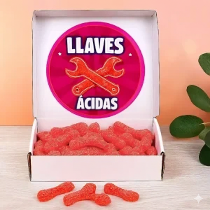 Quieres regalar chuches virales y no sabes cuales. ¿Eres fan de las chuches ácidas? Si eres de los que le gusta  Regalar Llaves Ácidas,  Entonces no puedes dejar pasar nuestra oferta con caja repleta de llaves ácidas, Las chuches virales para los amantes de los sabores intensos y ácidos. Estas gominolas en forma de llave son todo un clásico en el mundo de las golosinas, conocidas por su inconfundible textura fuerte y su recubrimiento ácido que hace vibrar las papilas gustativas desde el primer bocado.