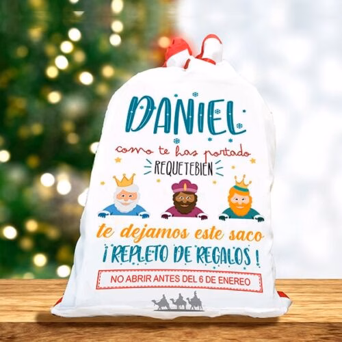 Saco que puedes personalizar añadiendo el nombre de la princesa o príncipe de la casa. Tienes la posibilidad de rellenar tu saco con una selección de productos que hemos preparado de la mejor calidad. Con este saco de los Reyes Magos no solo regalas calidad. Regalas felicidad.