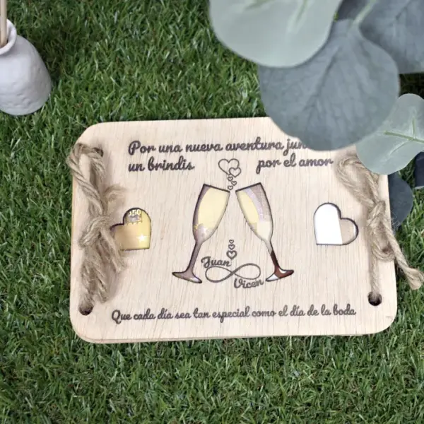 Este producto es un sobre fabricado en madera natural, grabado con láser, y completamente personalizable. Incluye los nombres de los novios, la fecha del evento y un mensaje especial, convirtiéndose así en un detalle único. Es ideal para guardar billetes o tarjetas regalo de forma sofisticada y original.