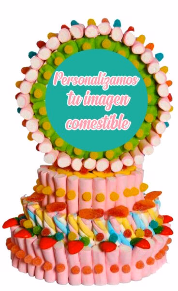 Nuestra Tarta con Gominolas y Esponjitas personalizada 3 pisos para los muy golosos. Además PERSONALIZADA con la fotografía, dibujo o texto que nos indiques.
