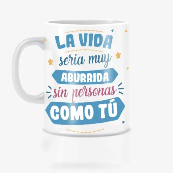 Con nuestra Taza La Vida Sería Más Aburrida. Sorprende a tu amigo, amiga o familiar con este regalo. Económico y lleno de significado. Nuestra taza de cerámica con el mensaje inspirador “LA VIDA SERÍA MÁS ABURRIDA SIN PERSONAS COMO TÚ” es perfecta para regalar a tu amigo invisible, transmitir buenos deseos y añadir un toque de alegría a su día.