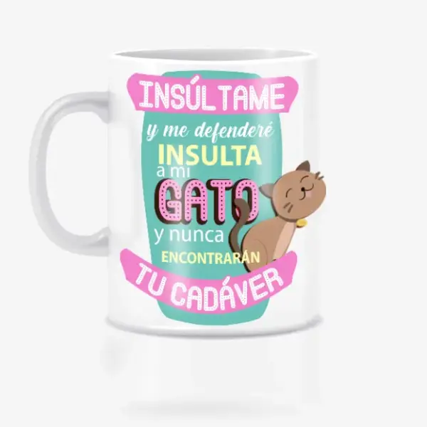 Descubre nuestra Taza para regalar a amantes de los gatos, perfecta para los amantes de los gatos! Nuestra exclusiva Taza de Regalo para Enamorados de los Gatos no solo es un complemento ideal para cualquier hogar, sino también una declaración audaz y divertida. Con la frase sublimada “Insúltame y me defenderé, insulta a mi gato y nunca encontrarán tu cadáver”, esta taza está diseñada para arrancar sonrisas y ser el centro de atención en cualquier reunión.
